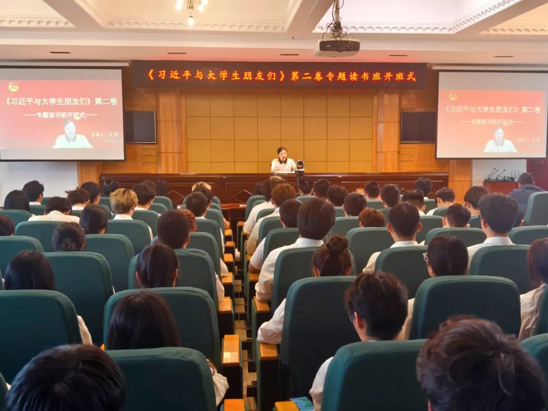 为落实《“为中国式现代化挺膺担当——青春年少好读书”2024 年主题读书季工作指引》要求,重点做好《习近平与大学生朋友们》(第二卷)的学习交流,在校园掀起学习贯彻习近平总书记重要寄语精神的热潮,让广大青年大学生感受到习近平总书记的殷切期望和自身肩负的责任和使命。伟德官网于5月17日晚17:30在九楼经济报告厅举办《习近平与大学生朋友们》(第二卷)专题读书班开班式,校团委全体人员、各二级学院团总支书记、青年教师代表、学生副书记、2022 级、2023 级团支书参加本次活动。校团委副书记唐晓恬介绍读书班日程安排及具体要求,校团委书记石倩作题为《大学生朋友-习近平》第一讲。
