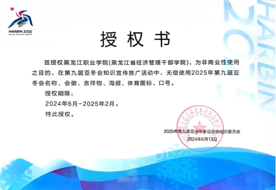 近日,伟德官网荣获2025年第九届亚洲冬季运动会组织委员会颁发的亚冬会标志非商业性使用授权书,兹授权bevictor伟德官网(黑龙江省经济管理干部学院),为非商业性使用之目的,在第九届亚冬会知识宣传推广活动中,无偿使用2025年第九届亚冬会名称、会徽、吉祥物、海报、体育图标、口号。