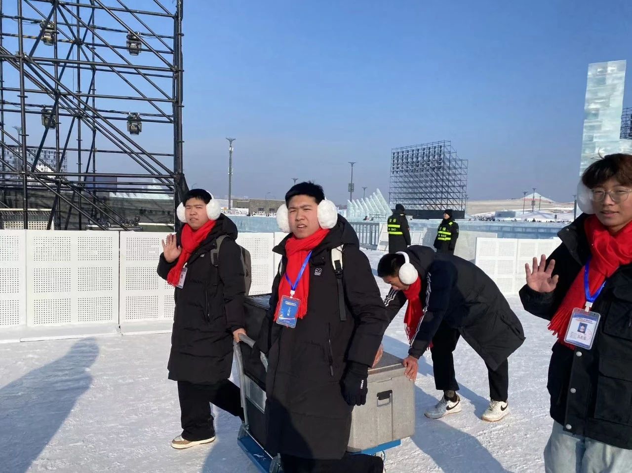 活动当日,志愿者们早早抵达冰雪大世界,迅速投入到紧张而有序的工作中。从31日上午10点直至次日凌晨,志愿者们始终坚守岗位,毫无怨言。他们的身影穿梭在冰雪大世界的每一个角落,肩负着协助演出的重任。从舞台布景的搭建与调整,到各类演出道具的搬运与摆放,每一个环节都有他们忙碌而专注的身影,沉重的道具在冰雪地面上拖行,只为确保每一场演出的道具都能精准就位。后台候场区域,同样有着志愿者们忙碌的身影,他们时刻准备着,为演员们提供所需的一切帮助。演出开始之后,志愿者们手拿荧光棒,热情地送到每一位观众手中,还不忘提醒大家注意安全,尽情享受这欢乐的时光。