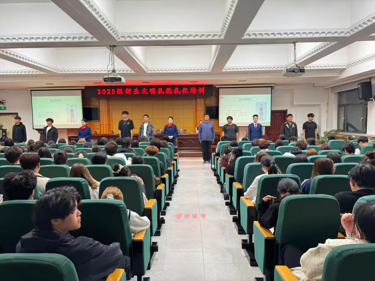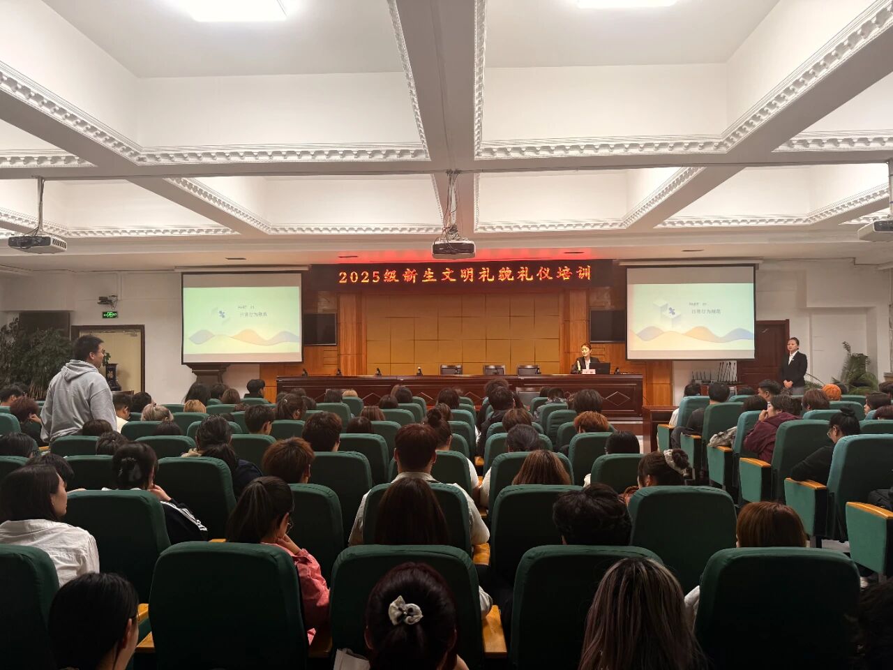 为进一步推进新生素质养成教育,将文明礼貌礼仪作为新生入学教育的重要一课,营造和谐文明的校园氛围,9月23日晚,学校在清华楼报告厅举办了2025级新生文明礼貌礼仪培训活动。本次培训特邀请旅游人文学院高级礼仪培训师张丽、王琪老师主讲,各二级学院的学生骨干参训。